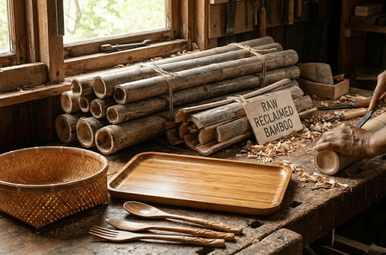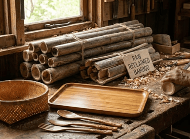 Crafted bamboo products from reclaimed materials.